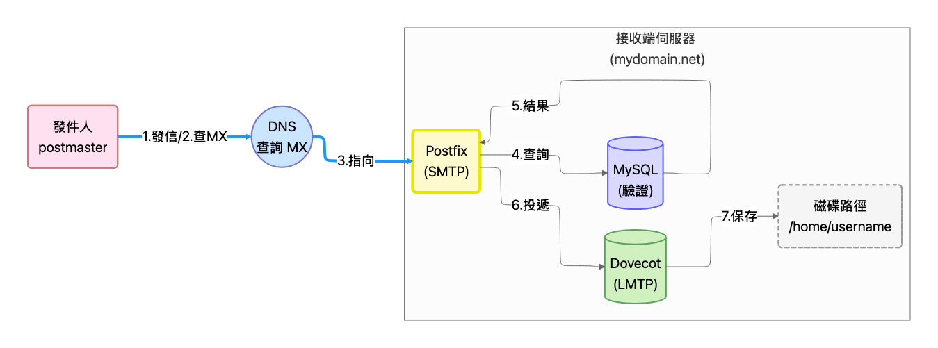 如果 Hostname 設錯(設成跟網域一樣 mydestination = mydomain.com): 當有人寄信給 user@mydomain.com 時,Postfix 會看著自己的 Hostname 說:「咦?這不是寄給我自己的嗎?」 於是它不去查 MySQL(客戶名單),而是去查 Linux 本機帳號 (/etc/passwd)。 結果當然查不到 user 這個帳號,最後導致 “User unknown in local recipient table” 的錯誤。